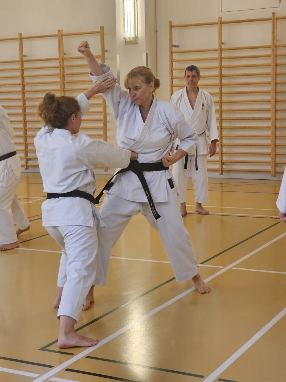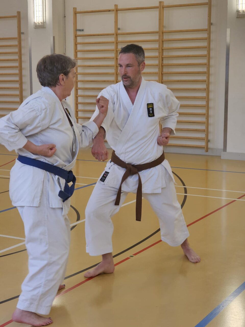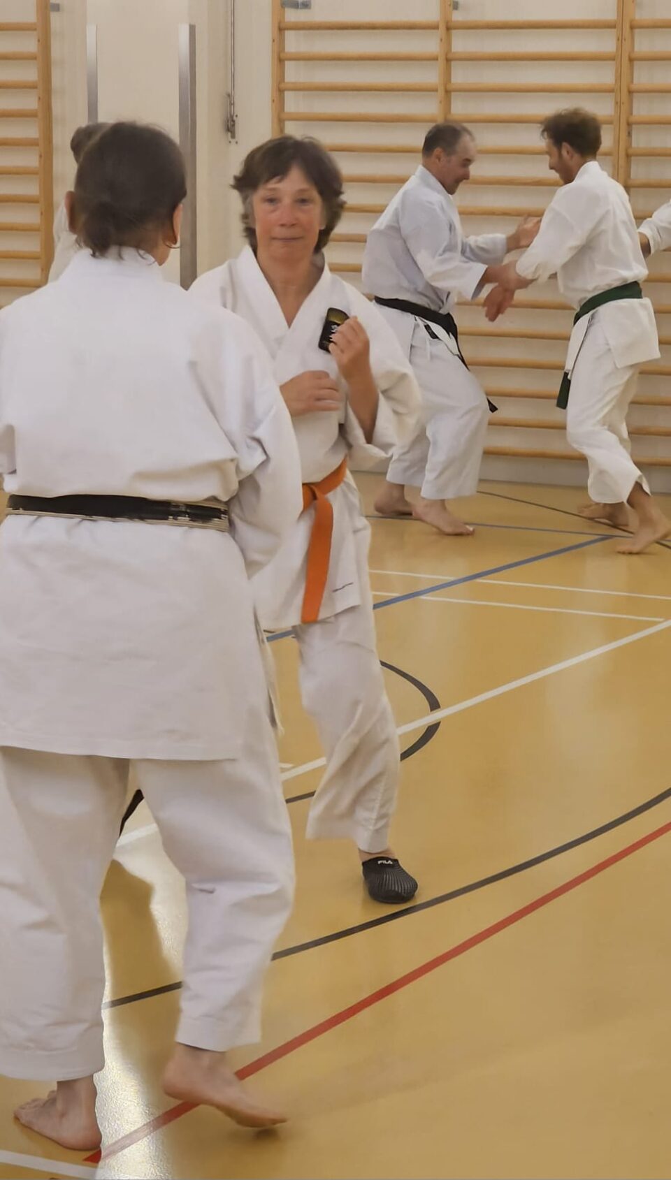 Von denen gab es einige. Entgegen der weitläufigen Ansicht ist Karate eine ernste, jedoch keine todernste Angelegenheit. Und so bleibt immer Raum für Erheiterung. Diesen Part übernahm Chanel. Sie war Vorzeigepartnerin und sollte nach einer Technik stehen bleiben. Das wollte nicht recht gelingen, weil Chanel rein- und rausrutschen intus hat. Nach einigen Versuchen klappte es dann prima.