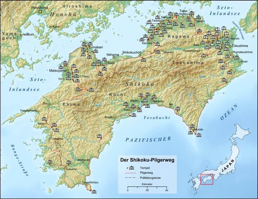 Titel: Shikoku‑Pilgerweg Karte.png Autor: Lencer Lizenz: GNU Free Doc­u­men­ta­tion License (GFDL) Ver­sion 1.2