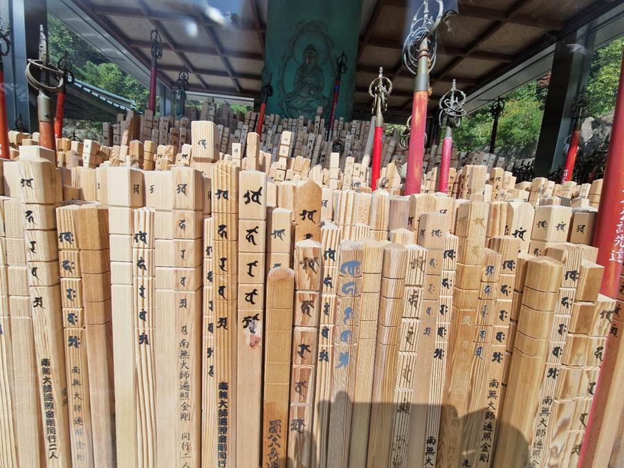Beim Tem­pel 88, am Ende des Pil­ger­weges, deponieren die Pil­ger ihre Stäbe, auf denen oft das Herz Sutra aufge­druckt ist.