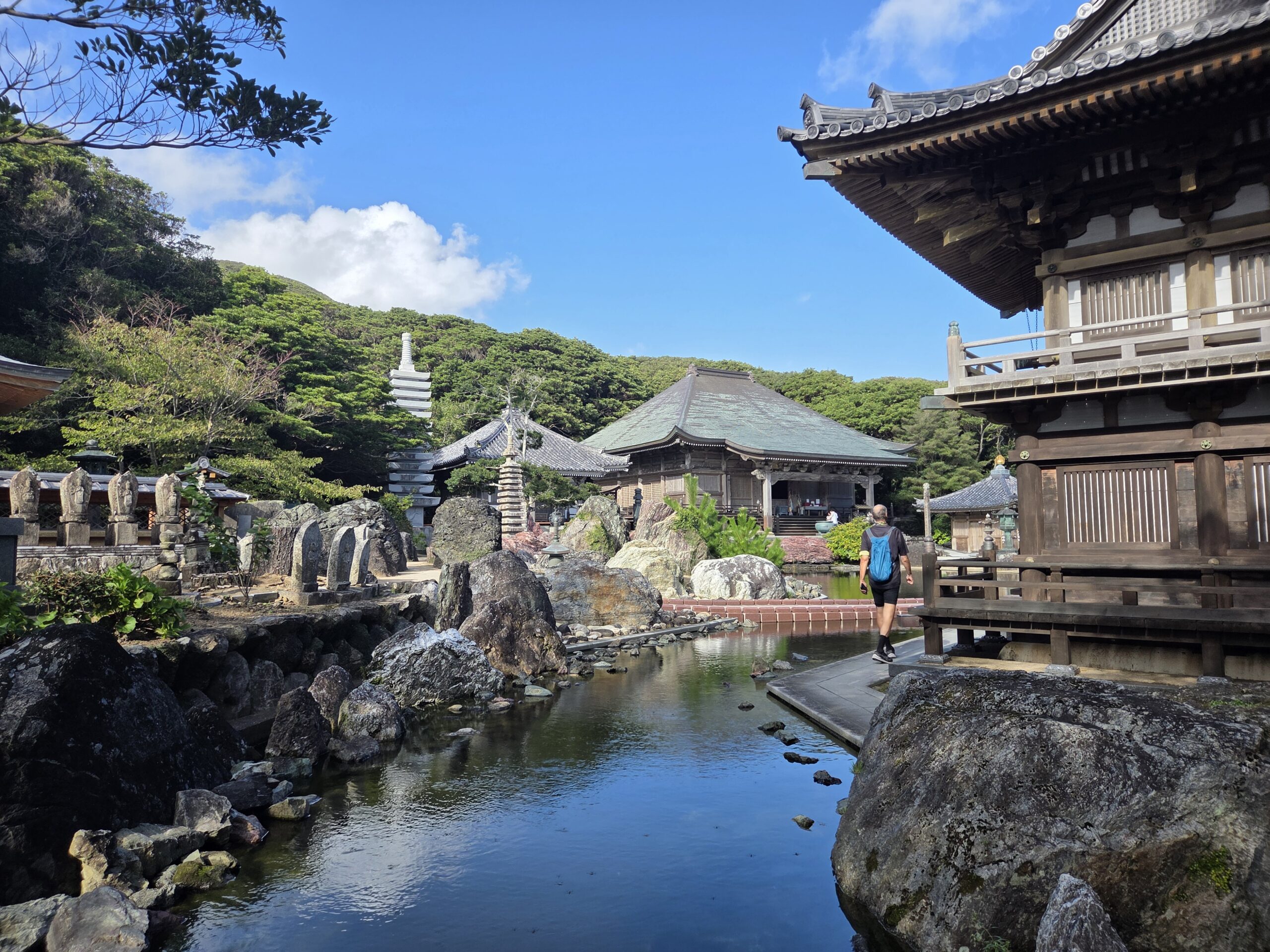 Die Pil­ger­reise führt durch Städte, Dör­fer, dem Meer ent­lang und immer wieder in die Berge. Viele Tem­pel sind erhöht gele­gen. Das ist zuweilen anstren­gend, wird dafür mit Aus­sicht belohnt. Generell ist die Land­schaft in Shikoku ausser­halb der Städte wild und weit­ge­hend naturbe­lassen. Wir sind Affen, Schlangen, Spin­nen und Vögeln begeg­net. Dör­fer lei­den unter Land­flucht. Die jun­gen Leute zieht es in die Städte. Als Folge sind viele Häuser unbe­wohnt und begin­nen zu ver­fall­en.
